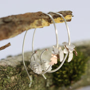 Look happy in their dreams don't they? Each little dormouse is hand crafted in solid silver or gold, and each nest is hand crocheted in fine silver, 9ct or 18ct gold, for the perfect snuggly little bed. As hoops, these detailed, beautiful earrings are pure practical luxury. Hoop earrings are very practical, as well as elegant. Without a clasp these long hoops are weighted to sit comfortably in your ear, wihout pulling, or risk of falling out. Rings, earrings and necklaces can all be tricky when you're scrambling through woodland, but wildlife jewellery is perfect as earrings.