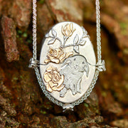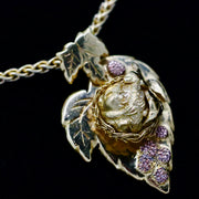 Bramble The Sleepy Dormouse, in her hand crocheted fine silver nest, is surrounded by juicy red gold blackberries. A charming, meaningful necklace for all nature lovers.
