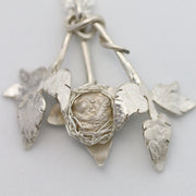 Beechnut The Sleepy Dormouse, in her hand crocheted fine silver nest, is encircled by protective beech leaves. A charming, meaningful necklace for all nature lovers.