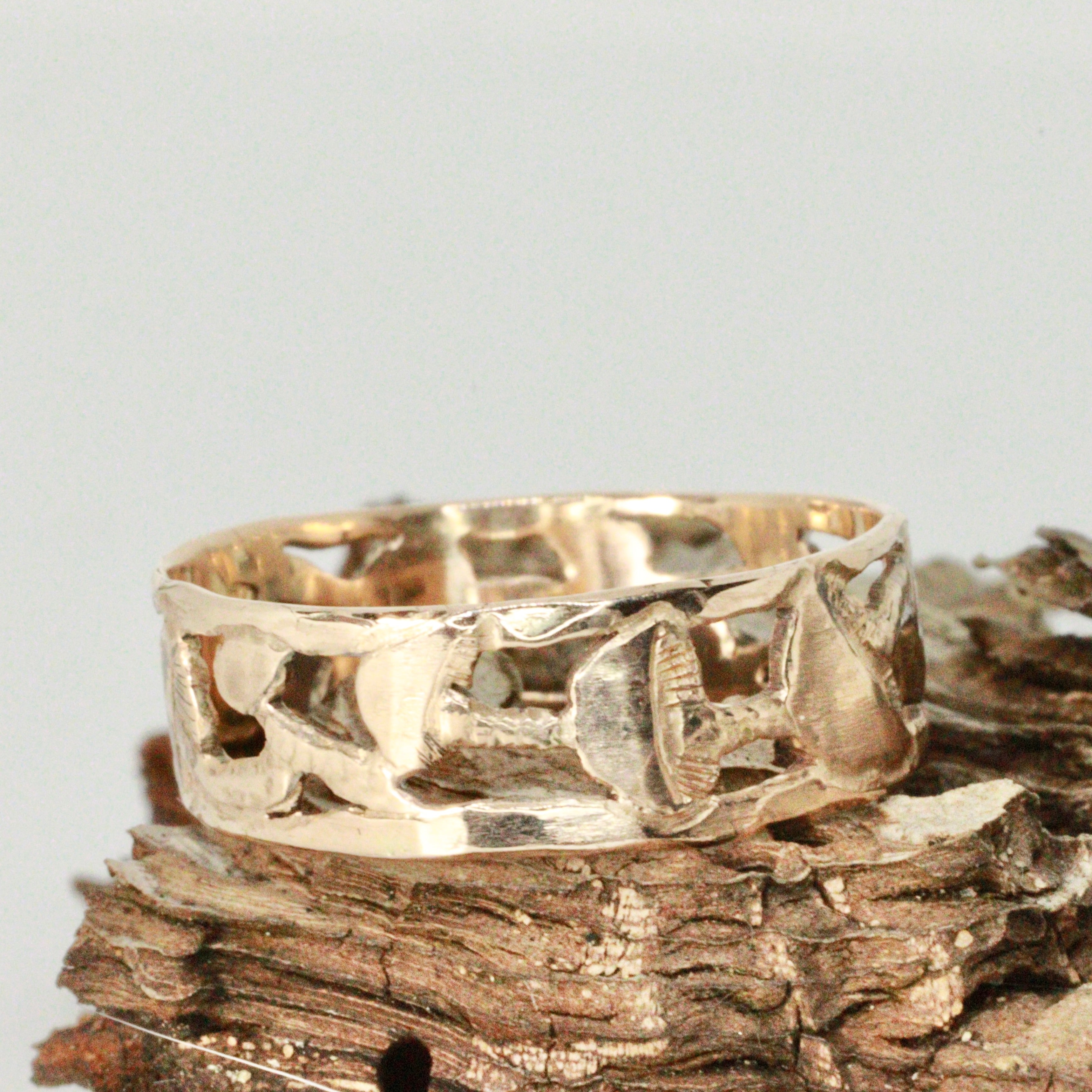 A unique hand crafted fungi mushroom ring crafted in 9ct red gold. Drawn by hand and pierced out as a complete one off, this is a sketch in metal, inspired by the beautiful abundance of Autumn.