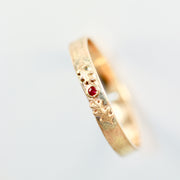3mm textured yellow gold band with hand cut red gold oak leaf detailing and set with a 1mm rubover set ruby