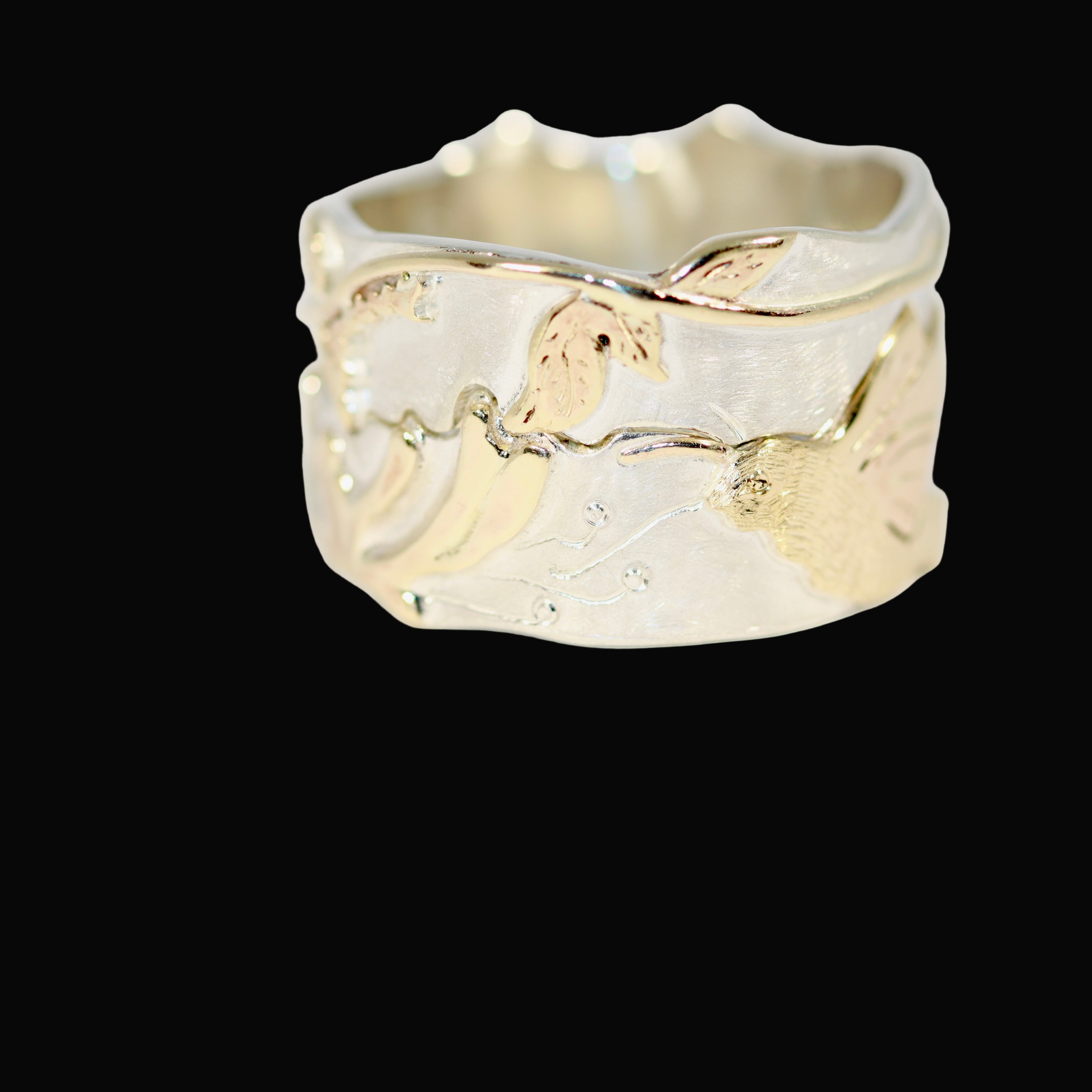 Hand crafted in 18ct white, red and yellow gold, a hare runs free through a meadow of buttercups and poppies in this hand carved original ring.