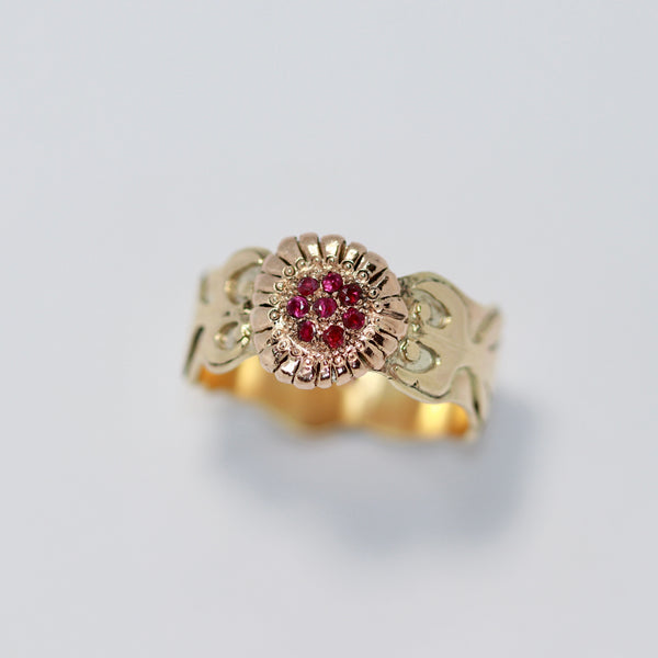 A unique broad banded ring with relief detail running all the way around. Inspired by the deep richness of the knautia macedonica scabious flower, red and yellow 9ct gold compliment eachother to highlight a cluster of 1mm rubies at the centre of the open flower.