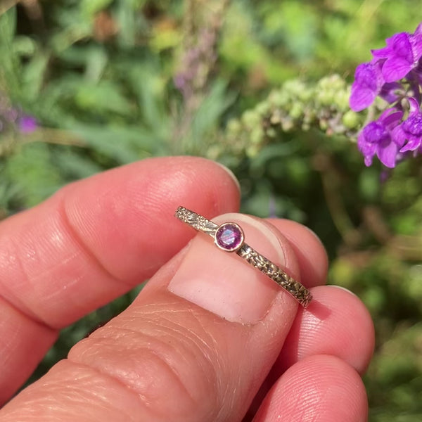 Hand carved skinny solitaire ring with intricate forget-me-not design encircling the ring and set with a deep rich pink red 3mm ruby.