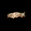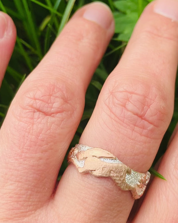 Hand crafted in sterling silver, layered with 9ct red gold, a hare runs free through a meadow of buttercups and poppies in this hand carved original ring.