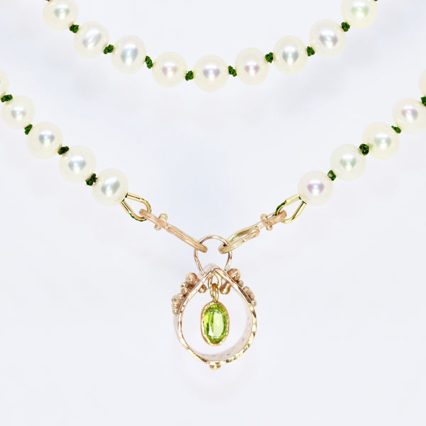 Deep green nylon silk thread gives strength to the string of pearls and adds a contemporary twist to a classic. The pendant is 9ct rose gold, spectacle set with a soft green peridot which swings freely inside the pendant, catching the light as it moves.